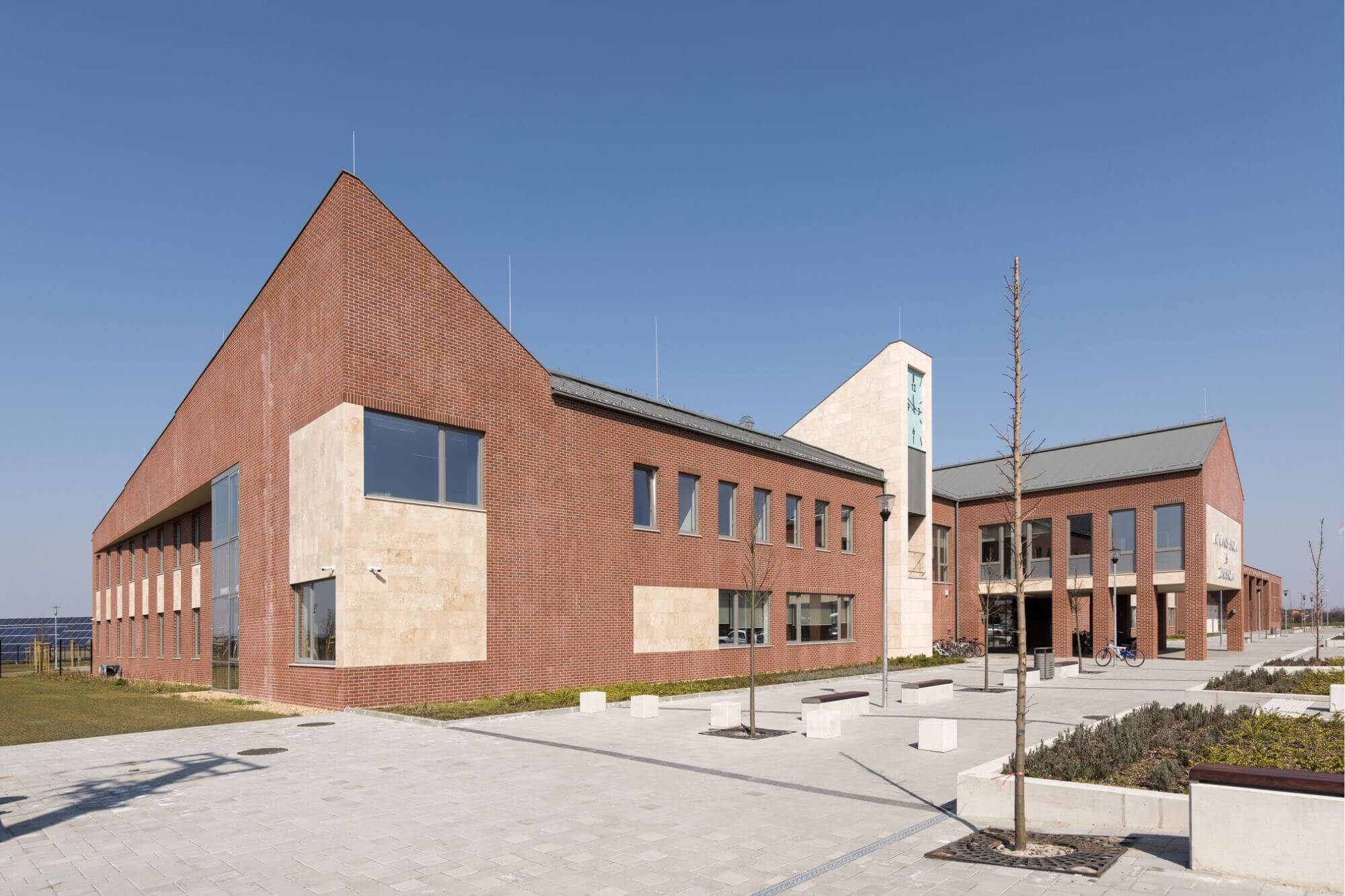 A Market Építő Zrt. generálkivitelezőként felelt a projekt megvalósításáért, kezelve a rendkívül összetett építési környezetet, a változó telekformát, a telepítést befolyásoló közműhálózatot és az ütemezett kivitelezési kihívásokat. A kivitelezés során kiemelt figyelmet fordítottunk a szerkezeti és építéstechnológiai minőségre: a három- és négyszintes épületek vasbeton alapozással készültek, a födémek és tetőszerkezetek megfelelnek a funkcionalitás és a biztonsági előírások követelményeinek, a belső térszerkezetek pedig modulárisan tagoltak, lehetővé téve a különböző oktatási és közösségi funkciók integrálását. A homlokzati kialakítás és az anyaghasználat a helyi klimatikus és esztétikai viszonyokhoz igazodik, biztosítva a tartósságot és a karbantarthatóságot.